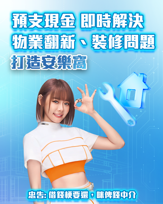 - 預先批核高達HK$150萬貸款額**,即時申請,現金最快21分鐘過戶^,方便現金支出大訂或細訂,及裝修期間繳付的額外費用